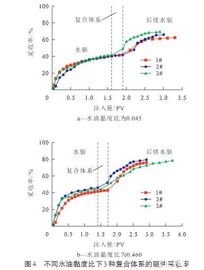 圖4不同水油黏度比下3種復(fù)合體系的驅(qū)油采收率