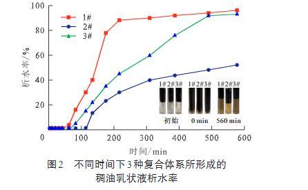 圖2不同時(shí)間下3種復(fù)合體系所形成的稠油乳狀液析水率