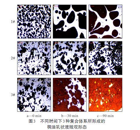 圖3不同時(shí)間下3種復(fù)合體系所形成的稠油乳狀液微觀形態(tài)