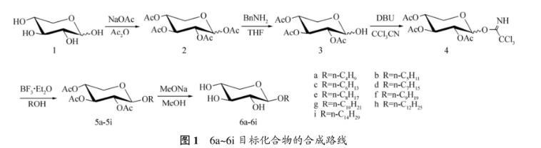 采用全乙?;哪咎?2)在四氯化錫催化下與一系列脂肪醇發(fā)生偶聯(lián)反應(yīng),對(duì)時(shí)間要嚴(yán)格控制,否則有部分轉(zhuǎn)化成α-異構(gòu)體,當(dāng)時(shí)間過(guò)長(zhǎng)時(shí),還會(huì)形成以α-糖苷為主的產(chǎn)物和少量2-位脫保護(hù)的糖苷副產(chǎn)物。參考烷基-β-D-葡萄糖苷等合成與性能研究成果,按照Scheme1所示的路線,以D-木糖(1)為原料通過(guò)乙?;⒚?-位乙?;⑴c三氯乙腈反應(yīng),得到相應(yīng)的三氯乙酰亞胺酯(4)。采用易于構(gòu)筑1,2-反式糖苷鍵的三氯乙酰亞胺酯法,以三氟化硼乙醚作糖苷化偶聯(lián)反應(yīng)的催化劑,使得具有鄰基參與效應(yīng)的三氯乙酰亞胺酯(4)與相應(yīng)的脂肪醇反應(yīng)及相應(yīng)的脫乙?;Wo(hù),合成一系列烷基-β-D-吡喃木糖苷,如圖1所示。本文作者對(duì)其溶解性、表面張力、乳化性能、液晶性能、熱穩(wěn)定性等理化性質(zhì)進(jìn)行研究。