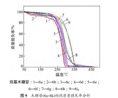 圖9所示為熱質量損失結果。從圖9可見:烷基吡喃木糖苷6a~6i均只有1個質量損失臺階,起始分解溫度分別為157.9,177.3,172.6,162.3,164.1,169.5,151.7,170.4和208.9℃左右,最大分解速率時的溫度依次為283.2,287.8,296.6,257.9,290.4,286.1,301.9,262.7和339.8℃。糖苷6a~6i熱分解完時的溫度分別為303.1,298.1,329.6,365.5,320.4,340.2,332.0,374.6和356.2℃??傎|量損失率為94.9%,89.9%,91.0%,91.9%,95.3%,96.6%,89.6%,88.5%和91.5%。結果表明:合成的烷基吡喃木糖苷在150℃以下是穩(wěn)定的。