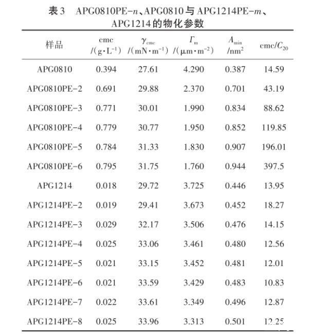由表3可以看出,APG0810PE-n的cmc、γcmc、Amin均高于APG0810,且隨著PO添加量的增加而增大,PO基團(tuán)的引入增加了分子的空間位阻以及被吸附分子在氣/液界面所占的面積。因此,Гm會隨之降低,并且隨著PO基團(tuán)的增加降低得更明顯。同樣,對于APG1214PE-m也有相同的趨勢。