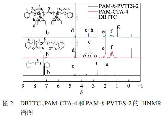 圖2為DBTTC、PAM-CTA-4和PAM-b-PVTES-2的1HNMR譜圖。如圖2所示,DBTTC的1HNMR譜圖曲線中δ=1.92(a)為氘代丙酮的質(zhì)子峰,δ=7.13~7.31(b)是苯環(huán)上的質(zhì)子峰;δ=4.56(c)的峰為亞甲基(—CH2—)的質(zhì)子峰;δ=2.62(i)為DBTTC樣品中含有的極少量H2O的質(zhì)子峰,可以確定成功合成了RAFT試劑DBTTC。PAM-CTA-4和PAM-b-PVTES-2的1HNMR譜圖曲線中,δ=4.80(j)為重水(D2O)的質(zhì)子峰;δ=7.27~7.48(b)是苯環(huán)上的質(zhì)子峰;δ=4.82(d)為酰胺基(—NH2)的質(zhì)子峰;δ=1.95~2.24(e)是主鏈上的次甲基(—CH—)的質(zhì)子峰;δ=1.31~1.66(f)是主鏈上的亞甲基(—CH2—)的質(zhì)子峰。在PAM-CTA-4曲線中,δ=3.78~3.82(c)為與苯環(huán)相連亞甲基的質(zhì)子峰。PAM-b-PVTES-2曲線中δ=3.39~3.43(c+h)為與苯環(huán)相連和乙烯基中的亞甲基(—CH2—)質(zhì)子峰;δ=0.93~0.95(g)為有機(jī)硅中甲基(—CH3)的質(zhì)子峰。通過FTIR譜圖和1HNMR譜圖可以確定合成了PAM-CTA-4和PAM-b-PVTES-2。
