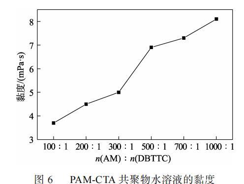 由圖6可知,隨著DBTTC用量的減少,共聚物水溶液黏度緩慢提升,由3.7 mPa·s逐漸升高到8.1 mPa·s,這是因?yàn)?,隨著RAFT試劑用量的減少,共聚物相對(duì)分子質(zhì)量增加,共聚物鏈段增長(zhǎng),共聚物鏈段之間的纏繞作用增強(qiáng),共聚物水溶液黏度升高。適當(dāng)?shù)卣{(diào)節(jié)RAFT試劑的用量可以達(dá)到控制共聚物水溶液黏度的目的。