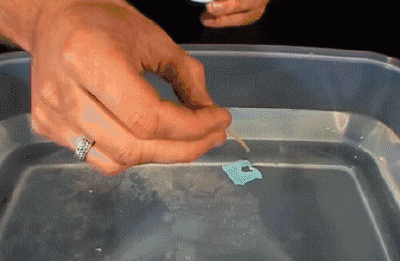 這個(gè)實(shí)驗(yàn)也是很多版本,比如說我小時(shí)候看到的版本是做一個(gè)小紙船然后在尾巴的地方弄一小塊肥皂。不過這里我就想著重介紹一下下面這個(gè)超級(jí)簡(jiǎn)單版:把固定面包袋子的那種塑料片摘下了,漂在水面上,然后在小洞的位置滴一滴洗潔精溶液,小船就動(dòng)起來了。