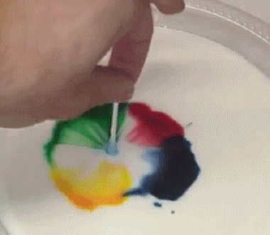 液體食品色素滴在牛奶上,然后把蘸了洗潔精的棉簽杵進(jìn)去,欣賞食品色素的流動(dòng)。
