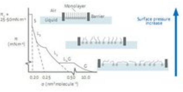 在進(jìn)行典型的等溫壓縮測(cè)試時(shí),單分子層先從二維的氣相(G)轉(zhuǎn)變到液相(L)最后形成有序的固相(S)。在氣相中,分子間的相互作用力比較弱;當(dāng)表面積減小,分子間的堆積更為緊密,并開始發(fā)生相互作用;在固相時(shí),分子的堆積是有序的,導(dǎo)致表面壓迅速增大。當(dāng)表面壓達(dá)到最大值即塌縮點(diǎn)后,單分子層的堆積不再可控(圖1)。