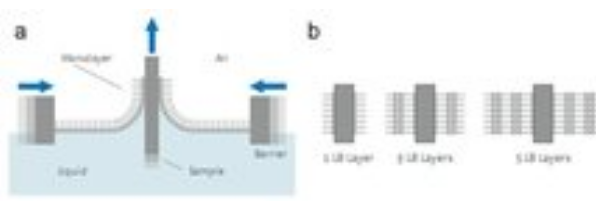 位于氣-液或液-液界面處不可溶的功能性分子、納米顆粒、納米線或微粒所形成的單分子層可定義為Langmuir膜。這些分子能夠在界面處自由移動(dòng),具有較強(qiáng)的流動(dòng)性,易于控制其堆積密度,研究單分子層的行為。將材料沉積在淺池(稱頂槽)中的水亞相上,可以得到Langmuir膜。在滑障的作用下,單分子層可以被壓縮。表面壓力即堆積密度可以通過Langmuir膜分析儀的壓力傳感器進(jìn)行控制 。