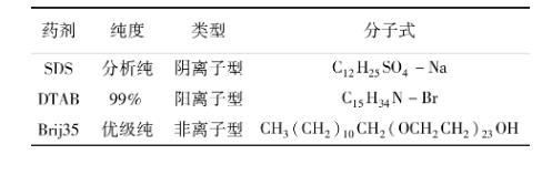 選用3種表面活性劑開展浮選精煤脫水過(guò)濾試驗(yàn)。3種表面活性劑分別為十二烷基硫酸鈉(SDS)、十二烷基三甲基溴化銨(DTAB)、月桂醇聚氧乙烯醚(Brij35)。3種藥劑的疏水端均為十二烷基,親水端分別為硫酸根、銨根以及聚氧乙烯醚,3種藥劑的物理化學(xué)性質(zhì)見表3。
