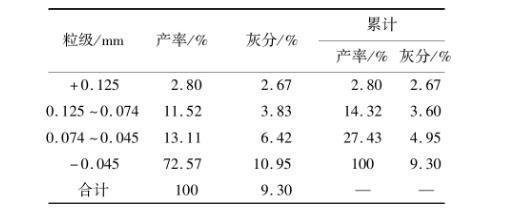 依據(jù)GB/T447—2008《煤炭篩分試驗(yàn)方法》對(duì)煤樣進(jìn)行小篩分試驗(yàn),浮選精煤樣品粒度組成見表2。由表2可以看出,煤樣中細(xì)粒物料含量非常高,其中-0.045 mm粒級(jí)產(chǎn)率高達(dá)72.57%,而+0.125 mm粒級(jí)產(chǎn)率僅有2.8%。該煤樣粒度細(xì),比表面積大,脫水時(shí)煤粒之間由于毛細(xì)作用存在大量毛細(xì)水,而且煤表面還存在大量的吸附水,難以通過(guò)機(jī)械力進(jìn)行有效脫除。此外,樣品中細(xì)粒含量高、粗粒含量少也會(huì)造成脫水過(guò)程中顆粒之間供水穿透的孔隙較少,脫水阻力較大。
