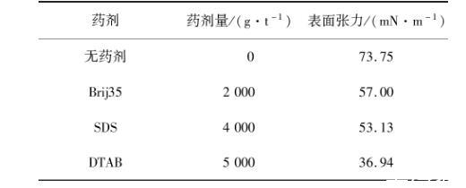 在浮選精煤過濾階段,濾餅中存在較強(qiáng)的毛細(xì)作用,水分難以排出。降低液相的表面張力可從根本上降低毛細(xì)力,使大量的毛細(xì)水從煤粒的間隙中排出。試驗(yàn)對(duì)不加藥及3種藥劑最佳用量時(shí)濾液的表面張力進(jìn)行測(cè)定,結(jié)果見表6。從表6可以看出,在不加藥時(shí)濾液的表面張力最高,為73.75 mN/m,比水的表面張力72.75 mN/m略高,其原因可能是浮選精煤表面殘留的浮選藥劑進(jìn)入了濾液。在添加了表面活性劑后,3個(gè)濾液樣品的表面張力均有不同程度的下降。其中,添加Brij35的濾液表面張力較高,為57.00 mN/m,添加了SDS的濾液表面張力略低于Brij35,為53.13 mN/m,而添加了DTAB的濾液表面張力最低,僅為36.94 mN/m。表面張力的降低可顯著促進(jìn)煤顆粒間毛細(xì)水的脫除。