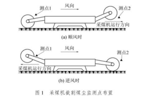 為研究大采高綜采工作面截割煤塵分布特征,分別在采煤機前后滾筒附近布置煤塵監(jiān)測點,測量順風情況下和逆風情況下大采高綜采工作面PM10,PM5,PM2.5的粉塵質量濃度,測點布置如圖1所示。測量時采煤機運行至工作面中部,即前后兩滾筒分別在65號和75號支架附近,測點布置沿風流風向依次布置,因此在順風情況下,測點1位于采煤機后滾筒附近,測點2位于采煤機前滾筒附近;逆風時,測點1位于采煤機前滾筒附近,測點2位于采煤機后滾筒附近。測量儀器選用SidePak AM520i型個體暴露粉塵儀。該儀器可實時顯示并記錄PM10、PM5、PM2.5質量濃度。