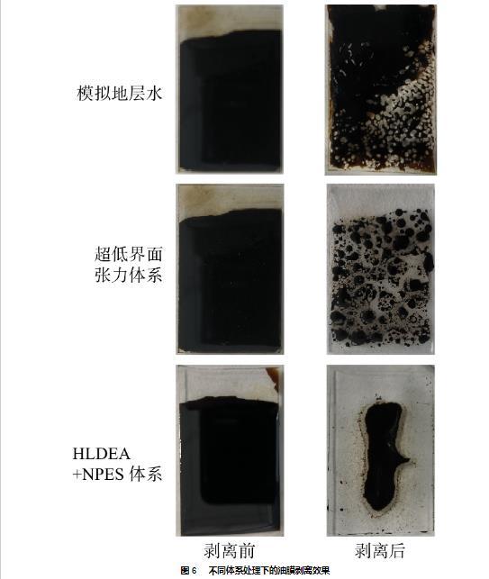 超低界面張力體系具有一定的潤濕調(diào)控性能,可以剝離44.2%的表面油膜,但其油膜剝離效率較差,剝離油膜僅在局部發(fā)揮作用,未能實現(xiàn)油膜的整體剝離,剝離后表面殘余油膜呈斑點狀。HLDEA+NPES體系的油膜剝離效率(75.3%)遠(yuǎn)高于模擬地層水(24.8%)和超低界面張力體系(44.2%)。HLDEA+NPES體系中HLDEA分子作用于油固界面,改變親油表面潤濕性,有利于油膜收縮;NPES分子作用于油水界面,改變了油水界面的性質(zhì),使得油滴容易變形并脫離玻璃表面,降低了油滴的形變阻力,提高了油膜剝離率。