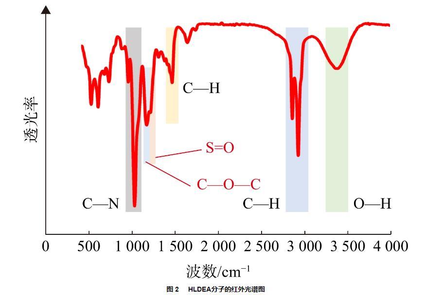 紅外光譜中峰的位置及形狀與分子中鍵的種類和環(huán)境具有對應(yīng)關(guān)系,通過分析所得譜圖可得到物質(zhì)的化學(xué)和結(jié)構(gòu)組成的相關(guān)信息。圖2所示為HLDEA分子的紅外光譜圖。由圖2可知,合成后的HLDEA在3354.44 cm?1處出現(xiàn)O—H鍵的伸縮振動峰,2921.96 cm?1和2852.77 cm?1處的雙峰代表C—H鍵的伸縮振動峰,1463.05 cm?1處出現(xiàn)C—H鍵的彎曲振動峰,1028.50 cm?1處出現(xiàn)C—N鍵的伸縮振動峰,1215.97 cm?1處出現(xiàn)了S=O鍵的伸縮振動峰及1168.25 cm?1處C—O—C鍵的伸縮振動峰。C—O—C鍵和S=O鍵對應(yīng)的振動峰來自生成的醚鍵和引入的磺酸根,這兩處峰的存在證明了反應(yīng)成功發(fā)生,磺酸基團(tuán)被接到LDEA分子上。