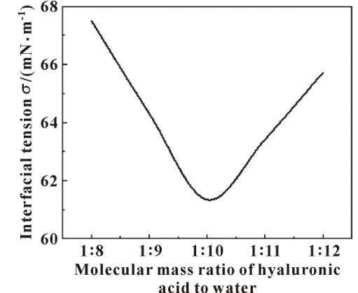 分子動(dòng)力學(xué)中認(rèn)為界面張力與不同方向上的壓力張量有關(guān),仿生黏液透明質(zhì)酸體系-水的界面張力通過(guò)KIRKWOOD和BUFF提出的力學(xué)定義來(lái)進(jìn)行計(jì)算。通過(guò)對(duì)5個(gè)不同質(zhì)量比的體系在平衡后200 ps的數(shù)據(jù)進(jìn)行統(tǒng)計(jì),得到了一個(gè)仿生黏液和水界面的界面張力平均結(jié)果,如圖1所示??梢?jiàn)在研究的質(zhì)量比范圍內(nèi),透明質(zhì)酸仿生黏液與水的界面張力始終保持在(60.00±10)mN/m左右,其中透明質(zhì)酸和水分子的質(zhì)量比接近1∶10時(shí),界面張力最小(為61.33 mN/m)。仿生黏液和水界面的界面張力越小,體系中仿生黏液和水界面的自由能就越低,界面就較穩(wěn)定。因此,可以認(rèn)為在研究的質(zhì)量比范圍內(nèi),質(zhì)量比1∶10時(shí),模擬黏液-水的界面穩(wěn)定性最優(yōu)。這同時(shí)也證明,通過(guò)分子動(dòng)力學(xué)模擬的方法可以初步預(yù)測(cè)仿生黏液在水體中的穩(wěn)定性。