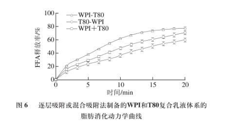 由圖6可知,采用WPI乳化均質(zhì)再添加T80吸附的乳液(WPI-T80),其消化速率和FFA釋放程度最大,其次是將WPI和T80混合后乳化均質(zhì)制備的乳液(WPI+T80),T80乳化均質(zhì)再添加WPI吸附的乳液(T80-WPI)消化速率最慢。