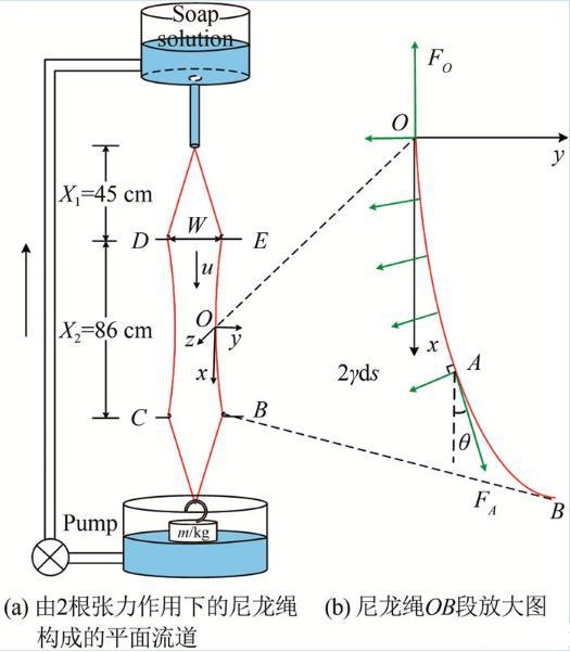 如圖1(a)所示,配制的皂液盛于上水箱中,經(jīng)一個狹長的出水管流出,進入一個由兩根直徑為0.32 mm的尼龍繩構(gòu)成的豎直平面流道(實驗中,尼龍繩一直處于下方砝碼施加的張力作用下)。緊接出水管口的流道為漸擴的擴張段,其下為流道寬度不變的實驗段和流道逐漸收窄的收縮段(在本文實驗中,擴張段長度X1=45 cm;實驗段長度X2=86 cm,實驗段入口寬度W=5 cm)。在擴張段,皂液在重力驅(qū)動下加速,當重力和空氣阻力平衡時充分發(fā)展,最終在實驗段達到勻速運動,之后經(jīng)收縮段流入下水箱,再被泵回至上水箱,形成往復循環(huán)。