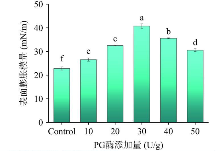 表面膨脹流變學(xué)是一個(gè)重要的表征,通過其可以確定吸附在氣-水界面的蛋白質(zhì)的相互作用。如圖2所示,隨著PG添加量的增大,脫酰胺玉米醇溶蛋白的表面膨脹模量呈現(xiàn)先增大后減小的趨勢(shì)。當(dāng)加酶量達(dá)到30 U/g時(shí)蛋白質(zhì)的表面膨脹模量達(dá)到了最大40.74 mN/m。這可能是因?yàn)檫m度的脫酰胺,增強(qiáng)了蛋白質(zhì)分子柔性,形成了致密的三維網(wǎng)狀結(jié)構(gòu),疏水性基團(tuán)暴露,蛋白質(zhì)分子之間的相互作用加強(qiáng),從而增強(qiáng)了蛋白質(zhì)在吸附層薄膜的穩(wěn)定性。當(dāng)PG量繼續(xù)增加時(shí),蛋白質(zhì)網(wǎng)絡(luò)結(jié)構(gòu)塌陷,重新形成了聚集體,疏水相互作用減弱使蛋白質(zhì)界面膜的穩(wěn)定性變差。