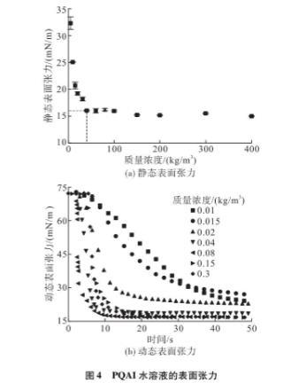 因此,本文采用芬蘭Kibron公司的表面張力儀在20一22℃下研究了溶液的界面性質(zhì),如靜態(tài)和動(dòng)態(tài)表面張力。不同PQAI溶液的靜態(tài)表面張力的變化如圖4(a)所示??梢钥闯觯谌ルx子水中加人少量表面活性劑,溶液的表面張力急劇下降。然而,在質(zhì)量濃度>0.04kg/m2時(shí),下降趨勢(shì)開始緩慢。這意味著PQAI水溶液的pcMc~0.04kg/m2,此時(shí)表面活性劑水溶液靜態(tài)表面張力為16.07mN/m。