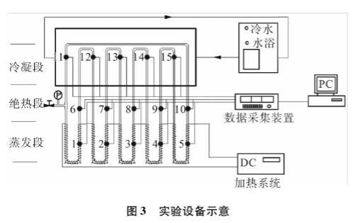 脈動(dòng)熱管由外徑4 mm、內(nèi)徑2 mm,經(jīng)氧乙炔正火處理后銅毛細(xì)管彎曲而成。圖3示出了脈動(dòng)熱管實(shí)驗(yàn)設(shè)備的示意圖。用誤差傳播法分析了實(shí)驗(yàn)裝置的不確定性。電壓電流精度為1%。本文中最小電壓和電流分別為17.9V和1.7A。此外,熱電偶的不確定度為0.1℃。在蒸發(fā)器和冷凝器的最小溫差為45℃時(shí),熱阻的最大相對(duì)不確定度為4.47%。