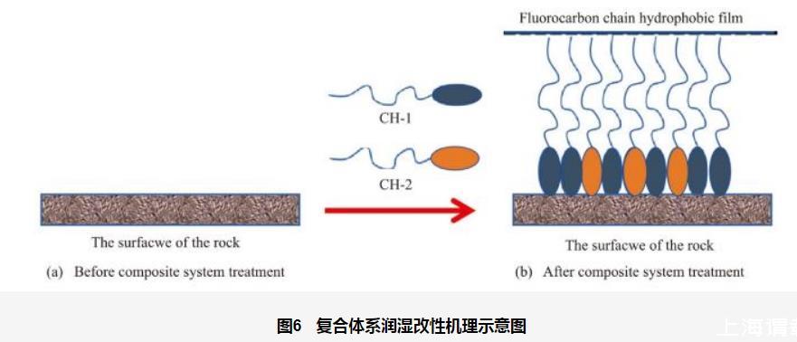 由圖5可看出,隨著表面活性劑濃度的增加,3種體系對應的接觸角均先增大后降低最終趨于平衡;陽-非離子復合表面活性劑體系的潤濕改性效果最好,可使模擬地層水在石英片表面上的接觸角由23.0°增至108.0°,使凝析油在石英片表面上的接觸角由36.0°增至102.0°;石英片經(jīng)CH-1或CH-2處理后,模擬地層水在石英片表面的最大接觸角分別為101.8°或97.7°,凝析油在石英片表面的最大接觸角分別為97.2°或94.5°。這是因為陽離子表面活性劑分子與非離子表面活性劑分子間存在復配協(xié)同效應。圖6為復合表面活性劑體系潤濕改性機理示意圖。由圖6可看出,陽離子表面活性劑分子與非離子表面活性劑分子構成的混合聚集體與砂巖表面羧酸類物質形成離子對的驅動力為靜電引力、氫鍵、范德華力的共同作用力,作用效果遠大于單一的靜電引力、氫鍵及范德華力。這些共同作用力使復合表面活性劑在界面上的吸附能力通常比單一表面活性劑更強。陽離子表面活性劑和非離子表面活性劑可同時或交替地吸附在固體表面,形成更緊密、更穩(wěn)定的吸附層,這種吸附層可以改變固體表面的性質,使其更疏水疏油。