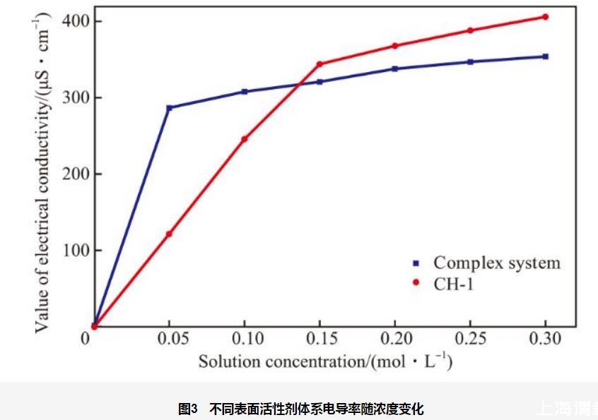 由圖3可看出,兩種表面活性劑的電導率均隨濃度的增加呈先迅速增大后緩慢增長的趨勢。這是因為表面活性劑濃度低于cmc時,表面活性劑主要以單體形式存在,單體中的離子可在溶液中自由移動,從而增加了溶液的導電能力;當表面活性劑濃度高于cmc時,一部分離子被包裹在膠束內(nèi)部,使得自由移動的離子數(shù)量增加幅度減小,遠小于濃度低于cmc時電導率隨濃度增加的幅度。陽-非離子復合表面活性劑電導率轉折點時的濃度低于CH-1電導率轉折點時的濃度。這是因為復配后,離子型表面活性劑的離子頭基與非離子表面活性劑的極性頭基之間可通過靜電引力、離子-偶極等作用相結合。這種相互作用增強了表面活性劑分子在界面上的吸附能力和在溶液中的聚集能力,使得形成膠束所需的濃度降低,即cmc減小。