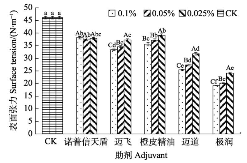 不同大寫字母表示同種助劑不同濃度間差異顯著(P<0.05);不同小寫字母表示同一濃度不同助劑間差異顯著(P<0.05)。