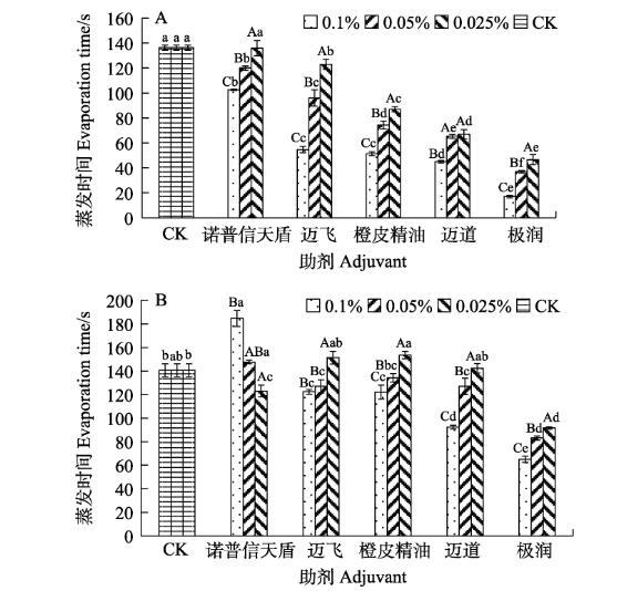 葉片背面,助劑質(zhì)量分?jǐn)?shù)為0.025%時(shí),與CK相比,極潤(rùn)助劑能使藥液蒸發(fā)時(shí)間縮短34.84%,其次是諾普信天盾縮短12.56%,而邁道和邁飛與CK間無顯著差異,而橙皮精油的蒸發(fā)時(shí)間增加9.24%;助劑質(zhì)量分?jǐn)?shù)為0.05%時(shí),極潤(rùn)助劑使藥液蒸發(fā)時(shí)間縮短41.00%,其次是邁道和邁飛均縮短9.72%,而橙皮精油和諾普信天盾與CK無顯著差異;助劑質(zhì)量分?jǐn)?shù)為0.1%時(shí),極潤(rùn)助劑使藥液蒸發(fā)時(shí)間縮短53.79%,其次是邁道縮短34.36%,橙皮精油和邁飛則分別縮短13.27%和13.04%,而諾普信天盾的蒸發(fā)時(shí)間增加31.28%(圖5B)。