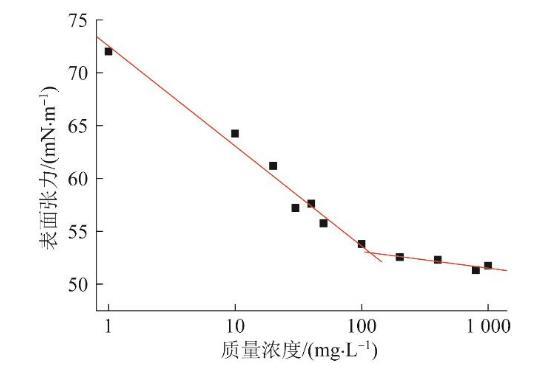 采用掛片法測(cè)量不同濃度h-PAMAM水溶液的表面張力(鉑片尺寸19.9 mm×10 mm×0.2 mm;精度0.01 mN/m)。不同濃度的h-PAMAM水溶液在室溫下的表面張力如圖2所示,由凝膠滲透色譜法(GPC)測(cè)得h-PAMAM的平均分子質(zhì)量為8 351 g/mol,并通過(guò)其計(jì)算了相關(guān)的熱力學(xué)參數(shù)。