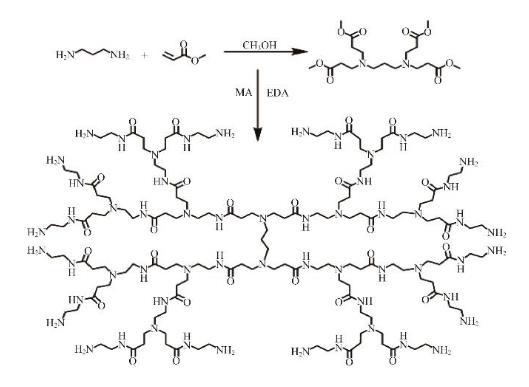 以1,3-丙二胺為反應(yīng)中心核,丙烯酸甲酯和乙二胺為支鏈,通過(guò)“一鍋法”合成h-PAMAM。具體的反應(yīng)過(guò)程可以分為以下幾步,首先將30 mL甲醇加入到三口燒瓶中,向其中加入1,3-丙二胺(0.1 mol),邊攪拌邊滴加丙烯酸甲酯(0.4 mol),隨后混合物在25℃下繼續(xù)攪拌反應(yīng)24 h。然后依次將乙二胺(0.28 mol)和丙烯酸甲酯(0.24 mol)滴加入燒瓶中,繼續(xù)反應(yīng)24 h。最后,在真空狀態(tài)下采用程序升溫:60℃反應(yīng)1 h,80℃反應(yīng)1 h,100℃反應(yīng)2 h,120℃反應(yīng)2 h,140℃反應(yīng)2 h。最終得到淺綠色、高黏度的樣品。合成路線(xiàn)如圖1所示。