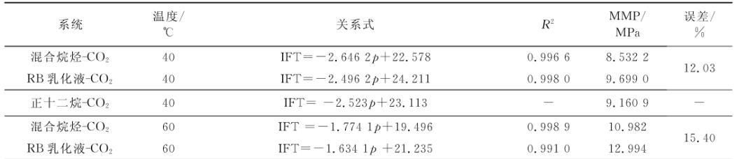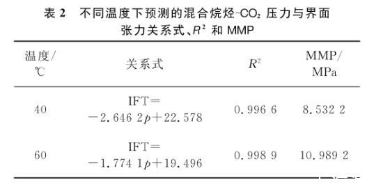 將擬合直線向橫軸方向繼續(xù)延伸,與壓力軸會有一個交點,該交點的物理意義即界面張力為零時的壓力大小。根據CO2的驅油機理和最小混相壓力所表現的特征,該點的橫坐標值即為實驗對象在特定溫度下的MMP。表2列出了40℃和60℃下所測氣液之間的壓力與界面張力的關系式和相關系數,以及對最小混相壓力的預測。