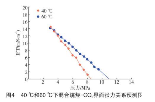 Kazemzadeh Y等的研究表明,平衡的CO2氣-油系統(tǒng)的界面張力通常隨著壓力線性降低,直到界面張力-壓力趨勢發(fā)生變化時,這時的壓力稱為臨界壓力,但界面張力為零的瞬間很難捕捉到。本實驗中,在溫度為40℃、壓力為8.5 MPa時,可以觀察到滴液針管中的混合烷烴不再形成橢圓形液滴,直接和CO2發(fā)生混溶而無斷續(xù)地流入釜中,所以無法通過實驗測量準確地得到CO2和混合烷烴界面張力為0時的對應壓力,即最小混相壓力。因此,采用外推法預測最小混相壓力。以橫軸為壓力值,縱軸為混合烷烴在被鹽水飽和的CO2環(huán)境下界面張力值的坐標系中分別繪制40℃和60℃壓力和界面張力的散點圖,如圖4。從圖4可看出,隨著壓力的升高,界面張力呈線性降低的趨勢。
