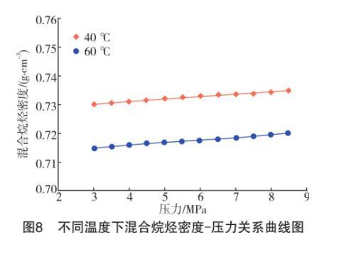 從混合烷烴密度-壓力曲線(見圖8)來看,整個測試壓力區(qū)間內溫度對混合烷烴的密度影響不大,因此液體密度也不會造成界面張力的較大變化。從CO2密度-壓力曲線(見圖7)來看,溫度在中高壓下對CO2密度的影響較大。尤其是在3.5 MPa之后,60℃下的氣體密度隨著壓力升高速率明顯高于40℃時的速率。在同一壓力下,氣體密度隨著溫度升高顯著降低。密度較低的CO2氣體分子分布越稀疏,與烷烴液面直接接觸的氣體分子越少,故降低了二者發(fā)生萃取和混溶的概率,間接地導致液體的界面張力值增加。