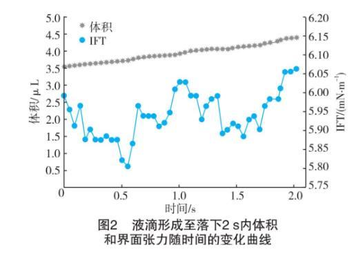 圖2為40℃、6.5 MPa時,液滴形成至落下的2 s內液滴體積和測得的界面張力隨時間的變化。由圖2可看出,在落下過程中體積逐漸變大,界面張力誤差在0.3 mN/m之內,雖然浮動不是很大,但任取一點不能較好地體現整體。因此,選擇在懸滴完全形成開始計算,到完全落下以幀為間隔,因為液滴完全形成時可以較清晰地得到液滴的最大曲率半徑,批量計算這段時間內的界面張力值,最后得到其平均值。為避免液滴的隨機性,在每種環(huán)境下選取3個連續(xù)滴落的液滴的平均界面張力值作為最終結果。減少了實驗的偶然性,使得到的結果更加可信。