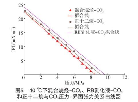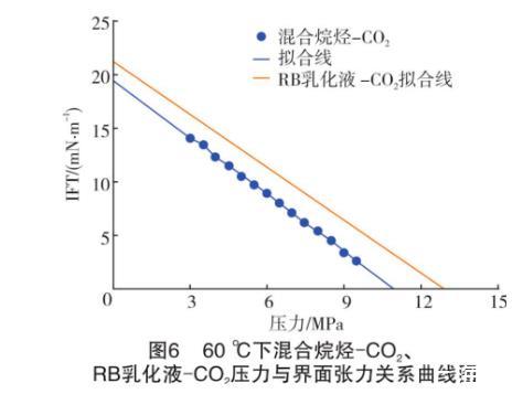 假設RB乳化液-原油不考慮斜率變化部分,始終以低壓階段(小于6 MPa)的斜率表示界面張力的變化。將表中同一溫度下不同系統(tǒng)的關系式展現在曲線圖上(見圖5和圖6)。從圖5和圖6可知,不論在哪個溫度下,混合烷烴和RB乳化液的壓力-界面張力曲線都接近平行,即兩種油的界面張力隨著壓力的升高幾乎以同樣的速度降低。計算得知,40℃和60℃下實驗混合烷烴和RB原油的壓力-界面張力關系式中的斜率誤差為6.0%和8.6%??v觀兩種油的組成發(fā)現,本實驗所使用的混合烷烴中正十二烷的摩爾分數達71.07%,而RB原油中的C12+的摩爾分數達到57.66%。也就是說,混合烷烴和原油的組分中占主導作用的是高碳數的正構烷烴。據姬澤敏等的大量實驗研究,界面張力在不同的正構烷烴-CO2體系中具有極好的規(guī)律性,在相同的溫度壓力條件下,正構烷烴的碳數和界面張力成正比關系。從文獻中RB原油組成分析得知,C12+的分子量高達366 g/mol,而本實驗中的混合烷烴的分子量僅為156.74 g/mol。由此得知,實驗誤差的主要來源是高碳正構烷烴的組成不同。