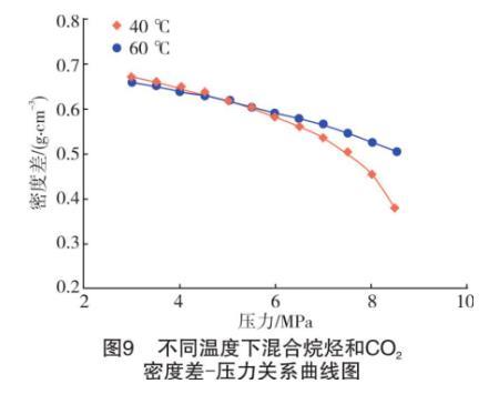 一方面,高溫可以對液體分子之間的相互作用力產生削弱作用,加劇分子間的不規(guī)則運動。此時,CO2氣體分子更容易與液相發(fā)生混溶,而定量表現出來的就是界面張力的降低。另一方面,根據混合烷烴和CO2的密度和二者的密度差數據,繪制出不同溫度下CO2氣體密度和氣液密度差隨壓力升高的變化曲線,如圖7~圖9所示。從密度差-壓力曲線(見圖9)來看,隨著溫度升高,在可比較的實驗壓力范圍內,中低壓(3~6 MPa)下不同溫度的氣液密度差非常接近,可以忽略不計。但高于6 MPa后,高溫下氣液密度差逐漸加大。較高的密度差導致了氣液難以形成混相,同一壓力下界面張力更大。