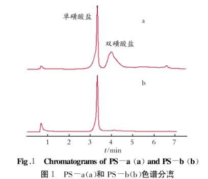 從色譜圖及色譜數(shù)據(jù)分析結(jié)果得知:PS-a和PS-b均含有單磺酸鹽和雙磺酸鹽,但兩者所含單、雙磺酸鹽的量差別較大;如果以峰面積為評價(jià)標(biāo)準(zhǔn),樣品PS-b中幾乎不含雙磺酸鹽部分,而樣品PS-a中單、雙磺酸鹽所含比例相當(dāng),約為1∶1。