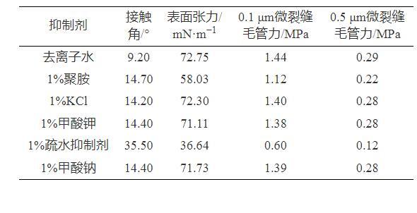 同時從表1中可以看出,疏水抑制劑能夠有效降低溶液的表面張力,當微裂縫的寬度為0.1μm時,微裂縫對于去離子水的毛管自吸力達到1.44 MPa,而加入疏水抑制劑后可以降低至0.60 MPa,而且隨著微裂縫寬度增加毛管自吸力逐漸降低。納米級別的微裂縫具有較高毛管自吸力,所以在體系構建時應封隔頁巖微納米級裂縫和加入疏水類的處理劑,弱化微納米級裂縫的毛管自吸力。