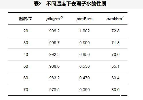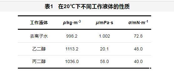 能夠在壁面上完全鋪展的液膜不僅僅與壁面的結(jié)構(gòu)和潤(rùn)濕性有關(guān),還與液體本身的物性有著密切關(guān)系。較高的黏度會(huì)導(dǎo)致液膜在流動(dòng)過(guò)程中變得更加穩(wěn)定且不容易破裂,使得液膜的分布相對(duì)均勻;表面張力會(huì)改變壁面上液膜的潤(rùn)濕性,從而影響液膜在壁面上的鋪展能力。因此,深入探討不同物性對(duì)液膜分布的影響,具有重要的理論意義和實(shí)際應(yīng)用價(jià)值。在實(shí)驗(yàn)中工作液體包括去離子水、乙二醇、丙二醇。工作液體的性質(zhì),如表1所示。同時(shí)溫度的變化將直接影響液體的黏度和表面張力,隨著溫度的升高液體分子的動(dòng)能也隨之增強(qiáng),分子間的相互作用減弱,黏度和表面張力都將減小,進(jìn)而影響液膜的形成和鋪展,不同溫度下去離子水的性質(zhì),如表2所示。