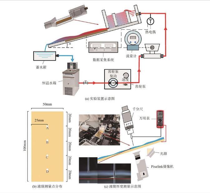 本實(shí)驗(yàn)的實(shí)驗(yàn)裝置,如圖3(a)所示。該裝置主要由液體回路、布液器和實(shí)驗(yàn)段三大部分組成。液體回路用于提供不同的流動(dòng)條件,以確保布液器能夠穩(wěn)定形成液膜。在這個(gè)回路中,液體從恒溫水箱(Julabo-Vivo RT2)中流出,恒溫水箱提供一個(gè)穩(wěn)定的入口溫度,由齒輪泵(Cole-parmer)控制液體流量大小,液體再流入流量計(jì)(Micro motion 2700,精度為±0.05%),流量計(jì)監(jiān)測(cè)管道內(nèi)液體的質(zhì)量流量,在布液器的入口端放置一個(gè)T型熱電偶(精度為±0.5℃)來(lái)測(cè)量入口溫度的變化,最后使用數(shù)據(jù)采集器(Keithely 2700)采集流量計(jì)的質(zhì)量流量、熱電偶的溫度和加熱片的功率。本實(shí)驗(yàn)對(duì)入口溫度要求較高,所以采用一些保溫措施,在不銹鋼管和布液器腔室周?chē)粚颖孛蓿瑴p少熱量損失。