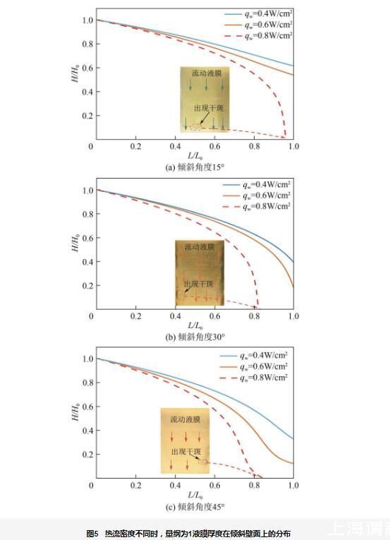 圖5所示的數(shù)學(xué)模型中,壁面傾斜角度分別為15°、30°和45°,噴淋密度為0.016kg/(m·s)、0.03kg/(m·s)和0.04kg/(m·s),入口溫度為70℃。通過(guò)施加不同的熱流密度加熱壁面,模型計(jì)算得出了量綱為1液膜厚度在傾斜壁面上的分布情況。結(jié)果顯示,當(dāng)熱流密度qw=0.8W/cm2時(shí),不同傾斜角度下的壁面上量綱為1液膜厚度均逐漸減小,最終降至零,出現(xiàn)了燒干現(xiàn)象。同時(shí),模型計(jì)算結(jié)果與實(shí)驗(yàn)結(jié)果相符,干斑位置均出現(xiàn)在壁面底部,這一現(xiàn)象的產(chǎn)生不僅是由于蒸發(fā)的作用,還與熱毛細(xì)效應(yīng)密切相關(guān)。在加熱過(guò)程中,熱毛細(xì)效應(yīng)促進(jìn)了液膜表面張力的變化,使得液膜的穩(wěn)定性減弱,導(dǎo)致液膜局部破裂。隨著蒸發(fā)效應(yīng)的增強(qiáng),液膜厚度逐漸減小,特別是在液膜的薄弱區(qū)域,蒸發(fā)速率提高,導(dǎo)致液膜厚度進(jìn)一步減小,最終在底部區(qū)域發(fā)生破裂。因此,干斑通常出現(xiàn)在壁面底部,這進(jìn)一步驗(yàn)證了實(shí)驗(yàn)結(jié)果與數(shù)學(xué)模型計(jì)算之間的良好一致性,并表明所建立的數(shù)學(xué)模型能夠有效預(yù)測(cè)液膜在傾斜加熱壁面上的流動(dòng)行為和燒干現(xiàn)象。
