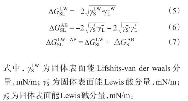 根據(jù)DLVO擴(kuò)展理論,首先分別通過式(5)和式(6)計(jì)算LW相互作用自由能(和AB相互作用自由能()。然后,通過式(7)計(jì)算去離子水溶液中的液-固界面作用能()。