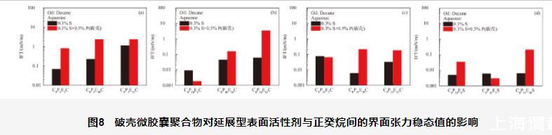 圖8破殼微膠囊聚合物對延展型表面活性劑與正癸烷間的界面張力穩(wěn)態(tài)值的影響