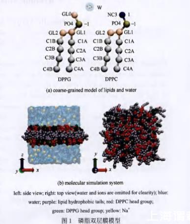 本文利用粗?;肿觿?dòng)力學(xué)模擬方法,考察表面張力強(qiáng)度為80×10?5N·cm?1條件下磷脂膜的破裂過程。通過建立磷脂膜破裂臨界時(shí)間和臨界表面張力值的分析方法,采用電中性的二棕櫚酰磷脂酰膽堿(dipalmitoyl phosphatidylcholine,DPPC)和帶負(fù)電的二棕櫚酰磷脂酰甘油(dipalmitoyl phosphoglycerol,DPPG)作為磷脂膜組分,考察表面張力施加速率以及磷脂膜組成對(duì)磷脂膜破裂行為的影響規(guī)律。進(jìn)一步地,提出“動(dòng)態(tài)”微觀對(duì)抗理論以描述磷脂膜破裂過程的動(dòng)力學(xué),旨在為磷脂膜和磷脂膜元件的設(shè)計(jì)及其應(yīng)用提供理論指導(dǎo)。