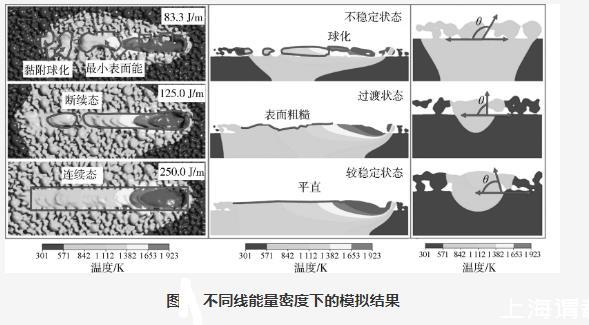為分析線能量密度對(duì)球化缺陷形成機(jī)理的影響,選取激光功率150 W,線能量密度分別為83.3 J/m、125.0 J/m和250.0 J/m的3組參數(shù)進(jìn)行數(shù)值模擬,結(jié)果如圖2所示。當(dāng)線能量密度為83.3 J/m時(shí),部分熔融金屬凝固并與周圍粉末黏附成球;部分熔融金屬在表面張力的驅(qū)使下傾向于減少表面能,迅速地成球;這兩種成球方式往往共同出現(xiàn)。這是因?yàn)榧す獾拇┩干疃葲]有到達(dá)基板,此時(shí)接觸角為180°,呈現(xiàn)不完全濕潤(rùn)狀態(tài),液態(tài)金屬流動(dòng)受阻,因此不能在基板上鋪展。當(dāng)線能量密度提高到125.0 J/m時(shí),單道由球化形態(tài)向斷續(xù)態(tài)過渡,雖然表面還比較粗糙,但是球化效應(yīng)明顯減弱,此時(shí)激光穿透深度剛剛到達(dá)基板,接觸角約為90°。當(dāng)線能量密度繼續(xù)提高到250.0 J/m時(shí),熔化的金屬粉末形成充足的熔融金屬,從而改善其流動(dòng)性,凝固后獲得高度均勻和連續(xù)的單道,激光穿透深度能夠穿透粉末床并熔化基板,并且接觸角大于90°。因此,球化缺陷的形成機(jī)理可以總結(jié)為能量密度太低,熔融金屬不能在基板上鋪展。判斷是否球化最直接的依據(jù)是觀察熔池深度是否穿透粉末層厚,并熔化了基板,也可以計(jì)算熔池的接觸角是否小于90°來判斷熔池的濕潤(rùn)性。此外,還可通過適當(dāng)提高線能量密度,提高熔融金屬的流動(dòng)性,以獲得更均勻和連續(xù)的單道。