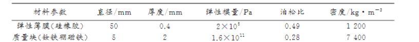研究對象MAMs結(jié)構(gòu):彈性薄膜中心兩面粘結(jié)圓形質(zhì)量塊。薄膜采用硅橡膠,通過勻膠機制備:按硅膠與固化劑100:3比例混合,低速檔(500 rpm,30s)甩開膠液,高速檔(1000 rpm,30s)均勻涂布于硫酸紙基底,靜置30min后剝離得到。高速檔轉(zhuǎn)速不同會導致薄膜厚度不同(如表1不同轉(zhuǎn)速所得薄膜厚度,具體值因排版缺失未完整顯示)。實驗中,薄膜制備厚度為0.4 mm。質(zhì)量塊采用釹鐵硼磁鐵。材料參數(shù)詳見表2。