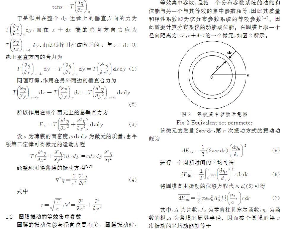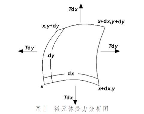 分析薄膜振動需進行受力分析。薄膜所受內(nèi)力僅為張力。設單位長度薄膜張力為T(N/m),單位面積質(zhì)量為ρ。取薄膜平衡位置在xy平面內(nèi)的微元體分析(圖1),當其受到垂直xy面的外力擾動后,會在張力T作用下產(chǎn)生橫向振動,恢復力主要為張力。