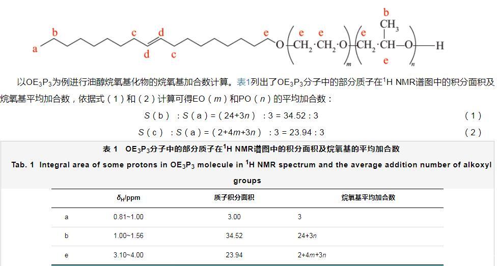以O(shè)E3P3為例進(jìn)行油醇烷氧基化物的烷氧基加合數(shù)計(jì)算。表1列出了OE3P3分子中的部分質(zhì)子在1H NMR譜圖中的積分面積及烷氧基平均加合數(shù),依據(jù)式(1)和(2)計(jì)算可得EO(m)和PO(n)的平均加合數(shù):