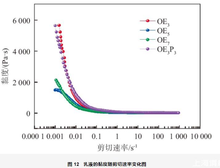 4)以4種油醇烷氧基化物為乳化劑制備的乳液都形成了層狀液晶,流變性測試結果表明4種乳液都屬于剪切變稀體系且加入OE3的乳液體系具有較好的穩(wěn)定性。