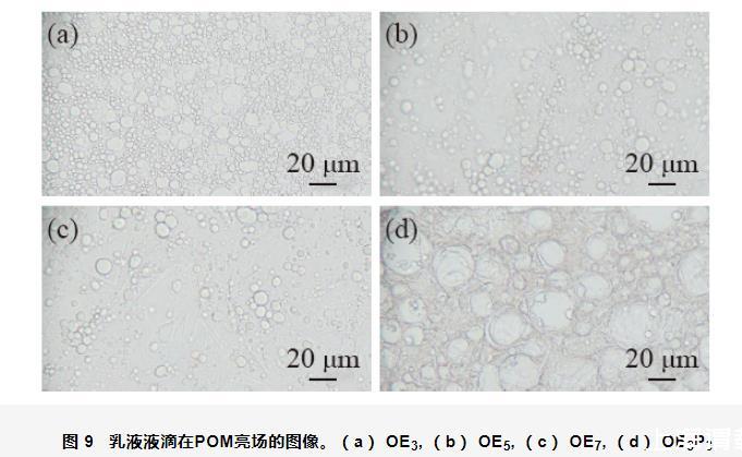 圖9(a)~(d)為分別以OE3、OE5、OE7和OE3P3為乳化劑制備的乳液液滴在POM亮場的圖像,可以發(fā)現(xiàn)球形液滴分散在連續(xù)的水相中,且以OE3為乳化劑形成的乳液具有均勻、細小的液滴。通過測定乳液液滴的粒徑分布可知,分別以OE3、OE5、OE7和OE3P3為乳化劑形成的乳液液滴的平均粒徑為3.65,3.95,4.66和15.34μm,即隨著OEn中EO加合數(shù)的增加,乳液粒徑的尺寸逐漸增大,且當在OE3中引入PO基團后,乳液的粒徑明顯增大且達到最大值。這可能是因為在乳液的形成過程中,油醇烷氧基化物表面活性劑分子在油/水界面定向排列可以增加液體石蠟在水中的分散性,使得液體石蠟油滴均勻分散在水中,形成細小的液滴,且表面活性劑分子定向排列形成的乳化膜可以防止乳液液滴聚并,從而可以使乳液保持較小的粒徑。但隨著油醇烷氧基化物分子結構中卷曲的EO鏈增長和支化的PO鏈的引入使得其在油/水界面的排列結構不夠緊密導致乳液粒徑變大。